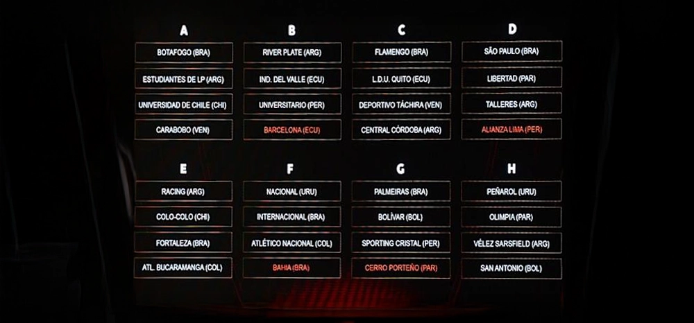 River Plate formó parte del Bombo 1 y salió sorteado para disputar el grupo B, donde deberá viajar dos veces a Ecuador para enfrentar a Independiente del Valle y Barcelona, y una vez a Perú para verse las caras contra Universitario.